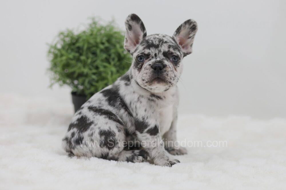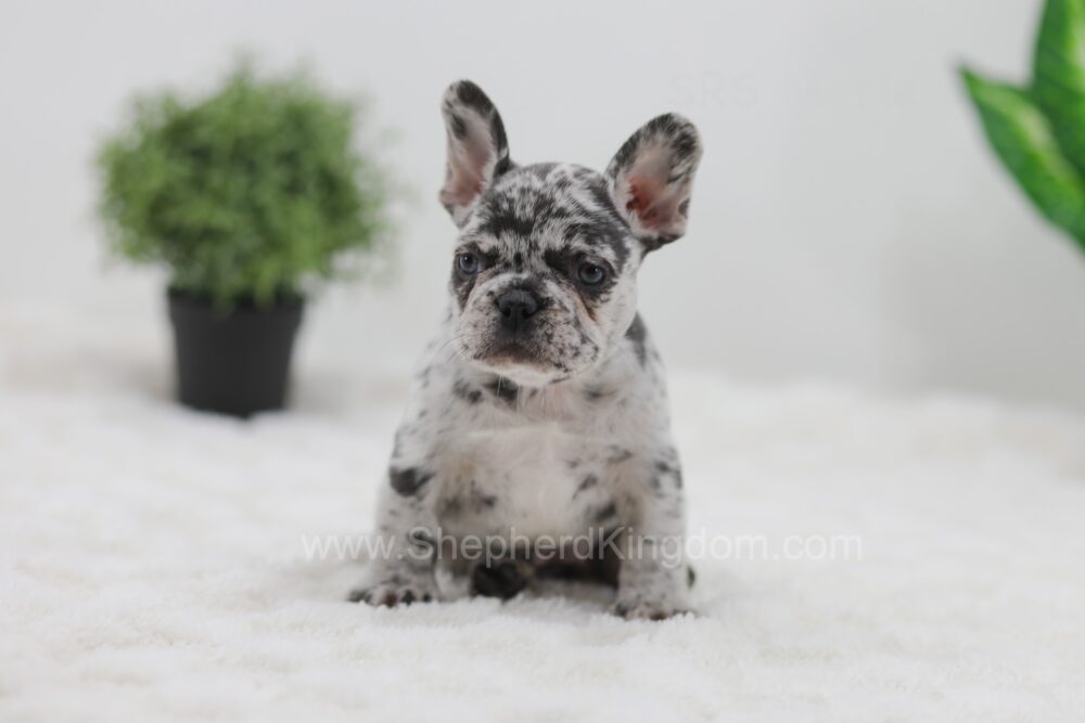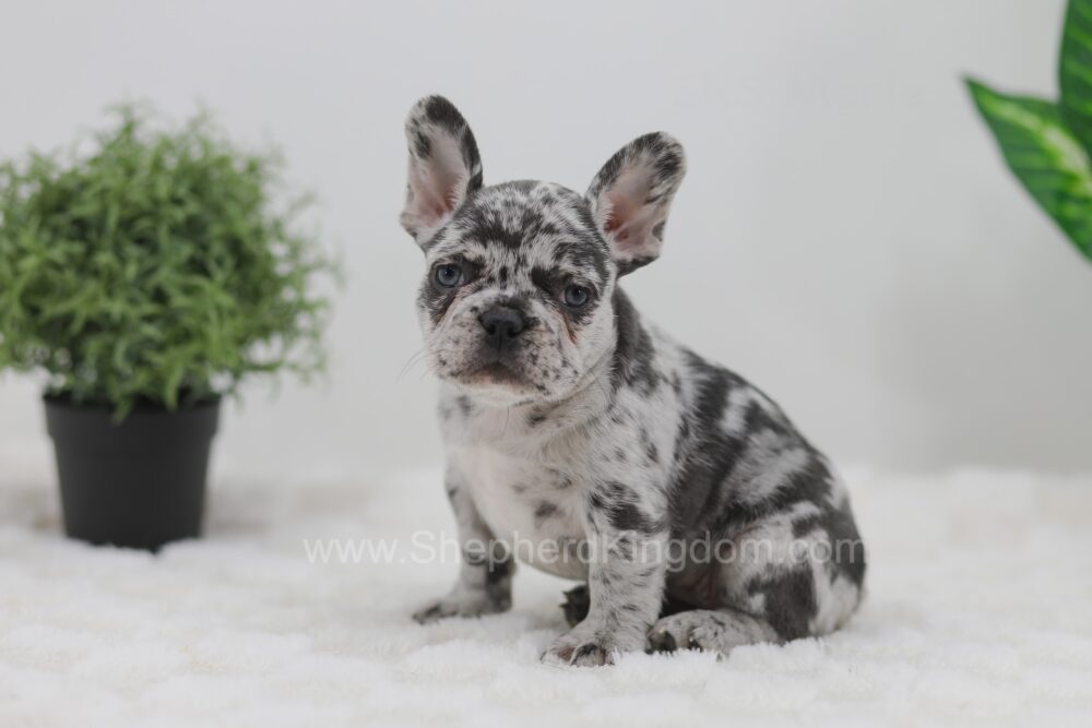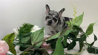 Ember is a vision of refined elegance, possessing a truly one-of-a-kind, “painter’s canvas” coat that features a harmonious, soft-focus marbling of smoky blue-gray and deep slate patches. As a blue merle French Bulldog, she embodies a rare and striking beauty, often complemented by striking, expressive eyes that seem to hold an intelligent, gentle soul.